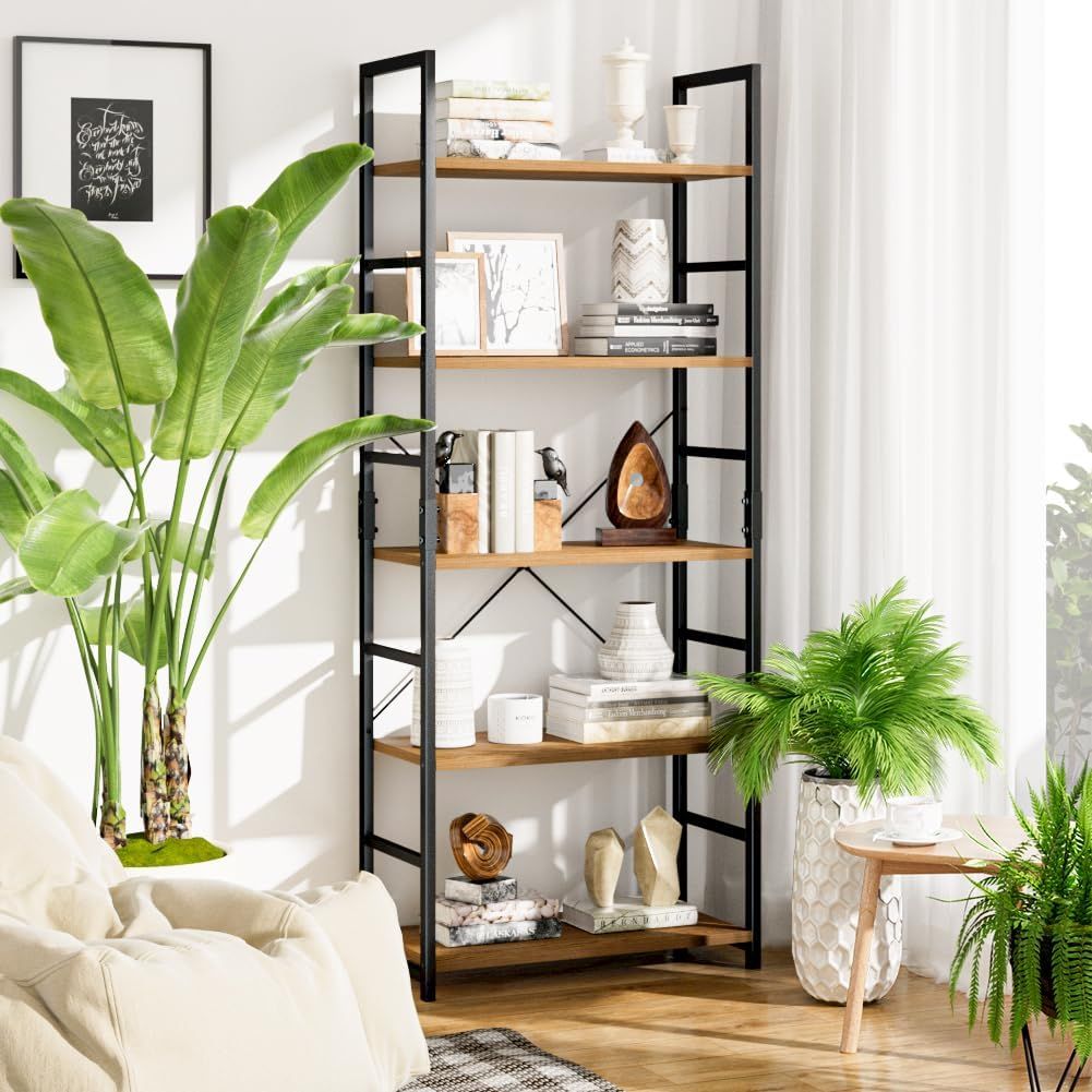 【5段多機能収納ラック】この5段式のアイアンラックは広々と使えます。さまざまなアイテムを置くのに有効に活用できます。書籍、アルバム、工芸品、鉢植えを飾ったり、置いたり使用してもOKです。きれいな化粧板を採用しており、傷や水分に強い、簡単に汚れを拭くことができます。棚板サイズ:幅60×奥行30センチ。