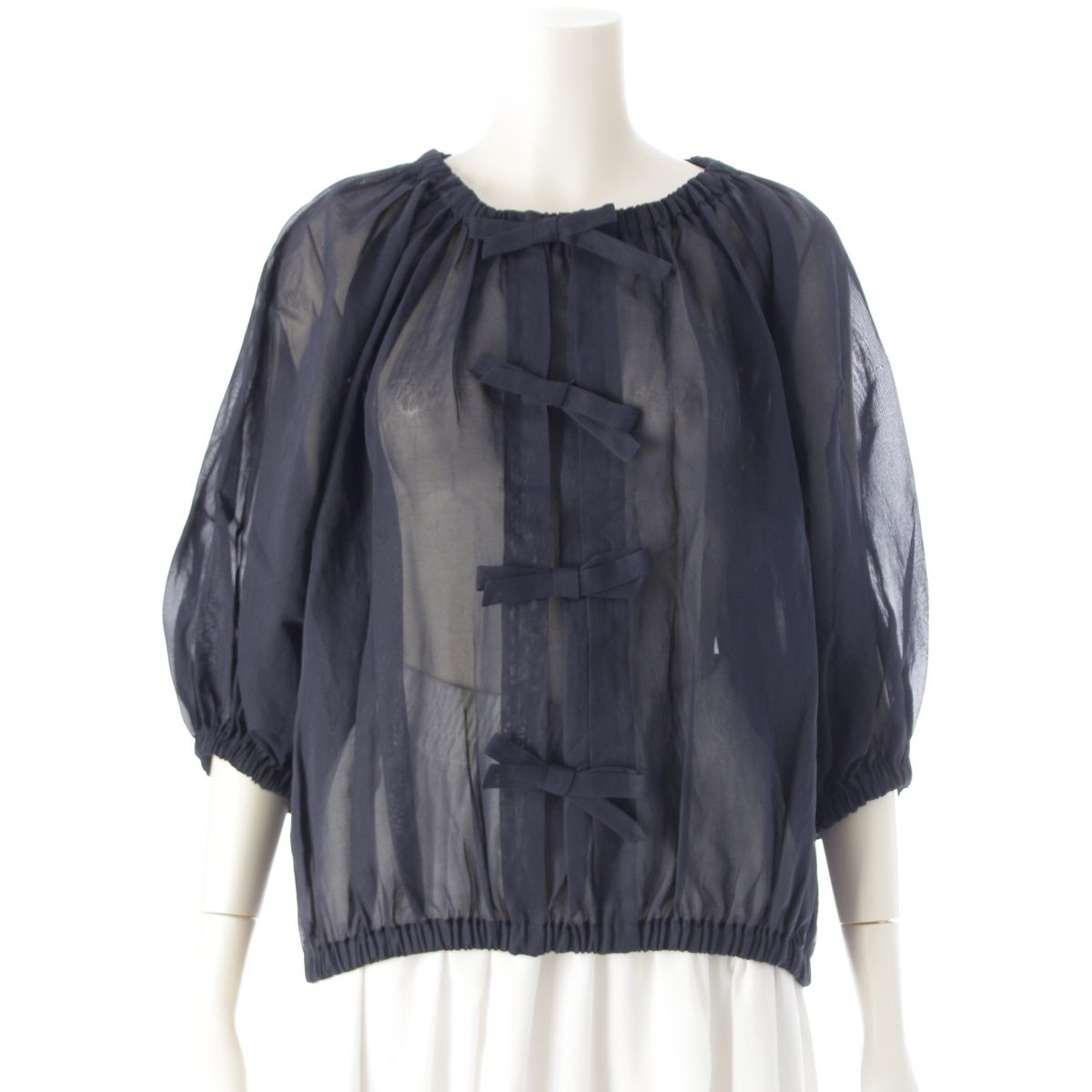 ティーマットマサキパリ コットン ドゥロワー別注 フロントリボン バルーンスリーブ シアー ブラウス トップス ネイビー 1