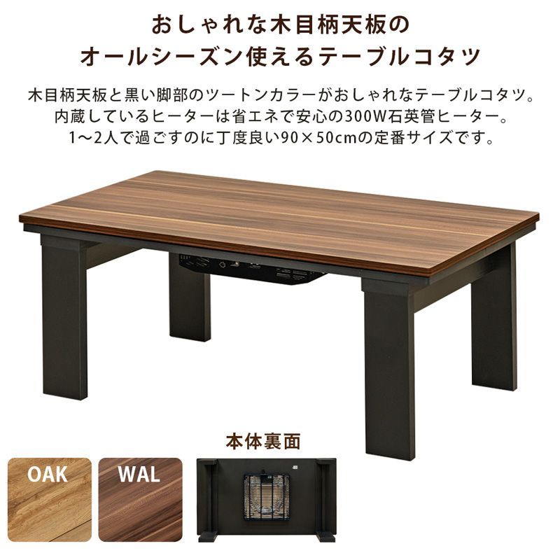 こたつ テーブル モダン カジュアル 木目調 ツートンカラー 90×50 本体 長方形 300W 石英管 こたつテーブル モダンリビングコタツおしゃれ 炬燵 火燵 PVC あったかおうち時間