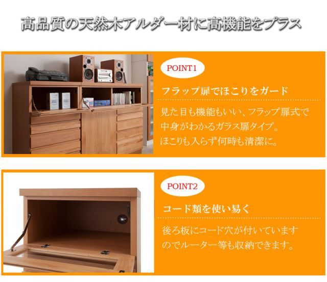 ■商品について/前面に取っ手を付けず、上部に掘り込み手掛け加工により天然木でありながらスッキリとしたデザインに仕上がっています。アルダー材特有の、美しい木目をそのまま活かしているので、、温かみがあり、かつ高級感も醸し出します。リビングを中心に充実した品揃え。天然木の温かみを是非、感じてください。FAX台としてはもちろん、窓下収納など様々なシーンで活躍します。深さの違う多段引出しで細々したものなど仕分け収納に抜群!リモコンの赤外線も受信可能なガラス付きフラップ扉にはAV機器なども収納できます。浅引出し以外はスライドレール付きで出し入れ楽々。幅90cmタイプは扉収納も付いて前面のアルダーの雰囲気抜群!同シリーズのTVボードと組み合わせて更に雰囲気UP!天然木アルダー材の質感とマッチしてお部屋に温かみと落ち着きを感じさせてくれる。天然木アルダー材の風合いはお部屋を明るく、しかも存在感があるのが特徴。シンプルなのに高級感があるアルダー材ナチュラルの家具をリビングの中心に。