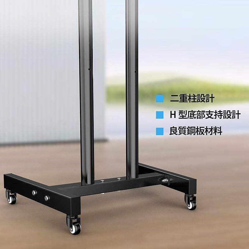 【安定・移動便利】:製品の安定性を高めるために、キャスター付きテレビスタンドは丈夫な鋼鉄で作られ、柱も2本で設計しております、耐荷重が50kg、テレビをしっかりとした取付けています。また、キャスターも軽くて360°回転できて、一人で楽に移動可能で、足でスムーズに固定できて、移動しても使用しても便利です。