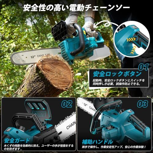 【12 インチ高切断力の充電式チェーンソー】弊社製品は革新的なブラシレスモーターを採用し、わずか 10 秒で直径 350mm の丸太を切断でき、時間とエネルギーを大幅に節約できます。そのブラシレスモーターにはたくさんの魅力があります。? 安全性抜群:火花や煙が出ないので、安全に使えます。?長寿命:ブラシ交換不要で、耐久性が高く、安定した性能を維持します。? 省エネ高出力:エネルギー消費が少なく、1 つのバッテリーでも長時間使えます。?作業性能安定:振動が少なく、作業効率と精度が高まります 。本体重量はわずか 2kg!家庭の DIY プロジェクトから樹木の伐採まで、あらゆる作業に対応できる万能ツールです。さらに専用の収納ケース付きで、軽量設計のため持ち運びも大変簡単です。ドライブリンク数:45 コマ。替刃を購入する場合は、この商品(ASIN:B09STZXHFF)をご注文ください。