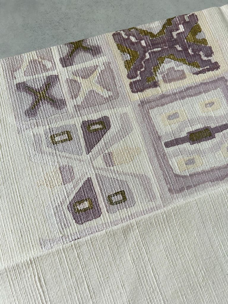 優しいトーンの紫やグレーで描かれた模様がアクセントとなり、控えめながらも存在感のあるデザインが魅力です。
