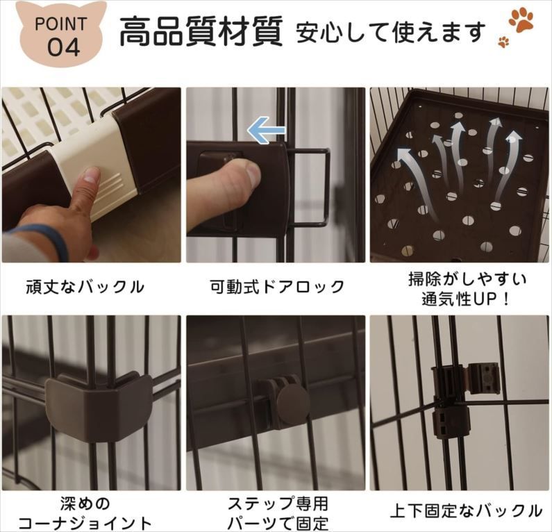取り付け方法:1.台座を用意 2.下段を用意 3.上段を用意 4.段を載せる 。パーツをはめ込むだけで組み立てられるので、DIYが苦手な人でも手軽に設置できます。ニーズに合わせて一段・二段・三段と設置可能なケージです。