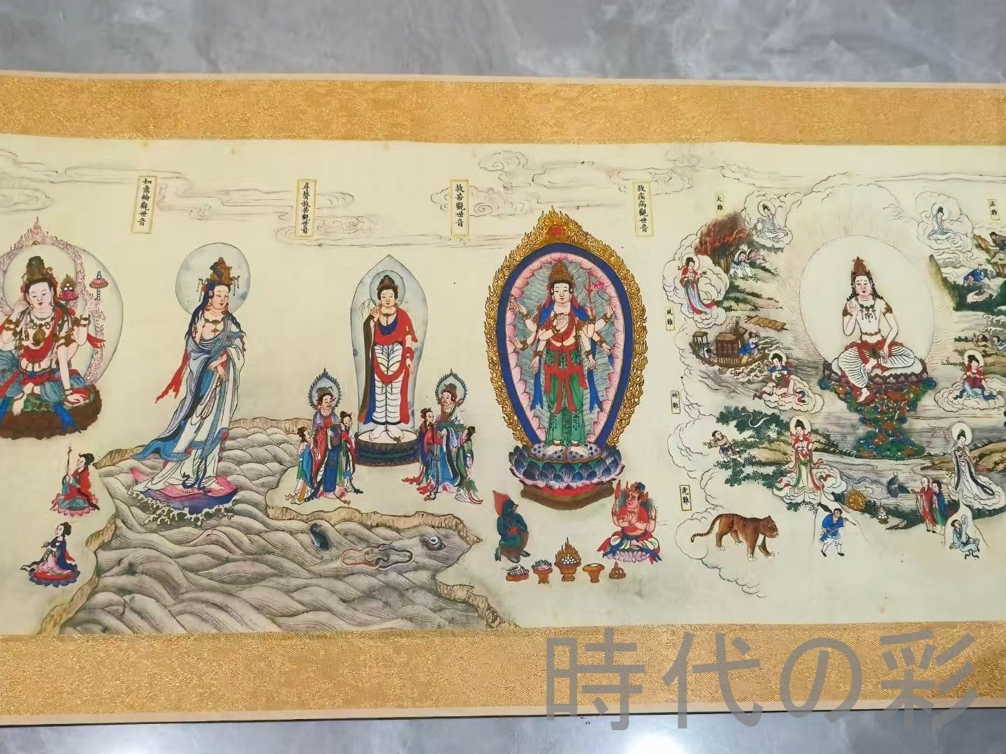 清代の画家・丁観鵬による仏教主題「法界源流図」を再現した十米手巻です。絹本に細密な筆致で法界の壮大な世界観を描き出しています。宗教美術・仏教美術の貴重な資料としても価値が高い逸品です。■汚れ傷等