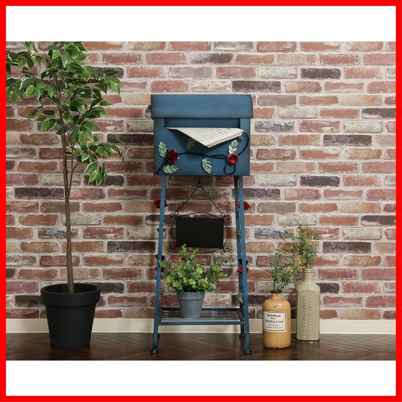 不二貿易 メールボックス 郵便受け ポスト 幅40.5×奥行33×高さ102cm ブルー 横型 スチール 棚付き 黒板付き ローズ 96760