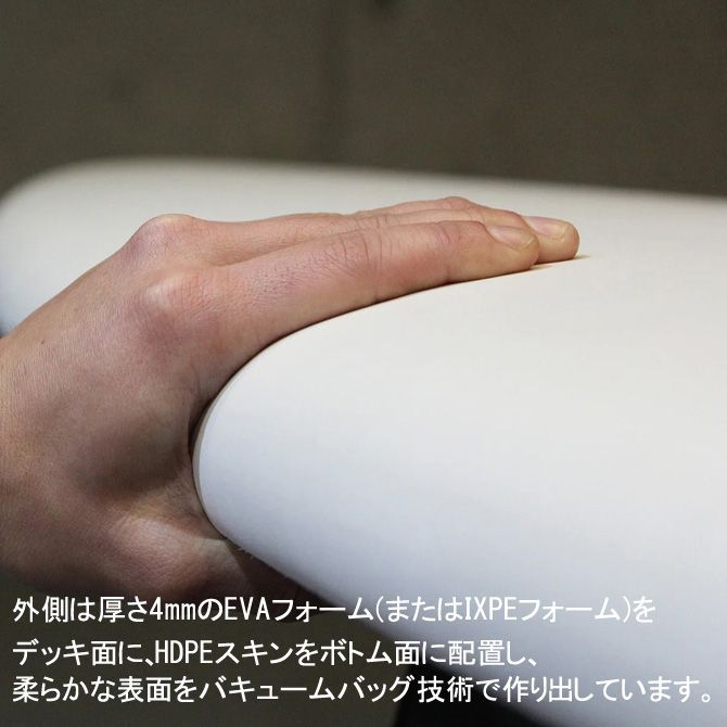 デッキはソフト、コアはEPSサーフボード。従来のソフトボードとは全く異なるサーフボードのような乗り味。幅広い層のサーファーを充分に満足させるルックスとコストパフォーマンス。ワックス不要のテクスチャー加工には擦れに最大限配慮したPEAR柄を施し、コア部分はストリンガー内蔵EPSフォームをエポキシクロスでラミネート。ニュースタンダード・サーフボードBEACHED DAYS AQUATIC DIVISION(アクアティックディビジョン)でより気軽に、よりかっこよく、楽しみましょう。