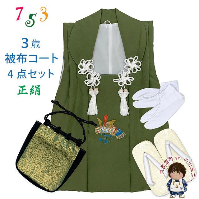 七五三 男の子 三歳 正絹 被布セット 被布コート 雪駄 信玄袋 足袋 4点コーデセット 抹茶色 兜と帷子 IBH 496-4 set 01