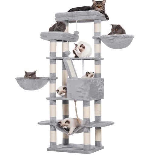 Heyblyキャットタワー大きな猫や多頭飼い超スリム据え置き型省スペース登りやすいハンモック2つ大きな見晴らし台天然麻紐爪研ぎ棒高さ173 cmライトグレーHCT 025 W