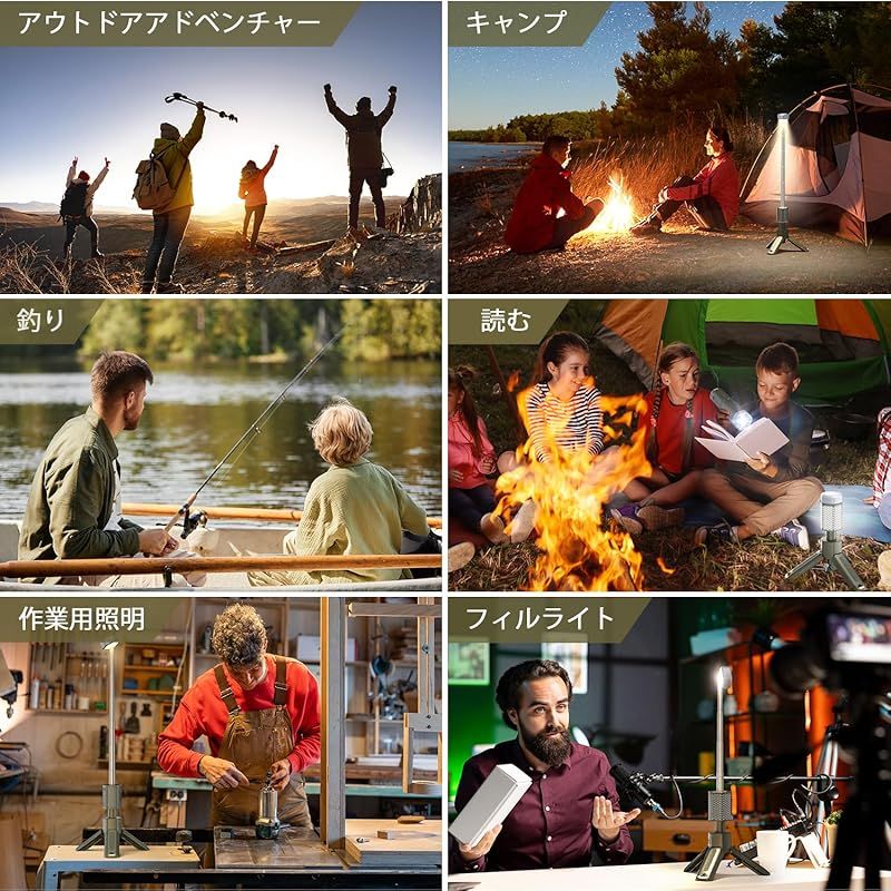【安定な三脚とマグネット底部】軽量で高密度な素材を使用されている調整可能な三脚と3本の固定ペグを加えて、芝生、土、砂利、岩などの表面にしっかりと固定できます。さらに、6つの超強力な磁石を備えた底部は、車、バイク、テントなどの金属ブラケットに照明ライトをしっかりと固定できます。いつでも照明の位置と角度を調整することができます