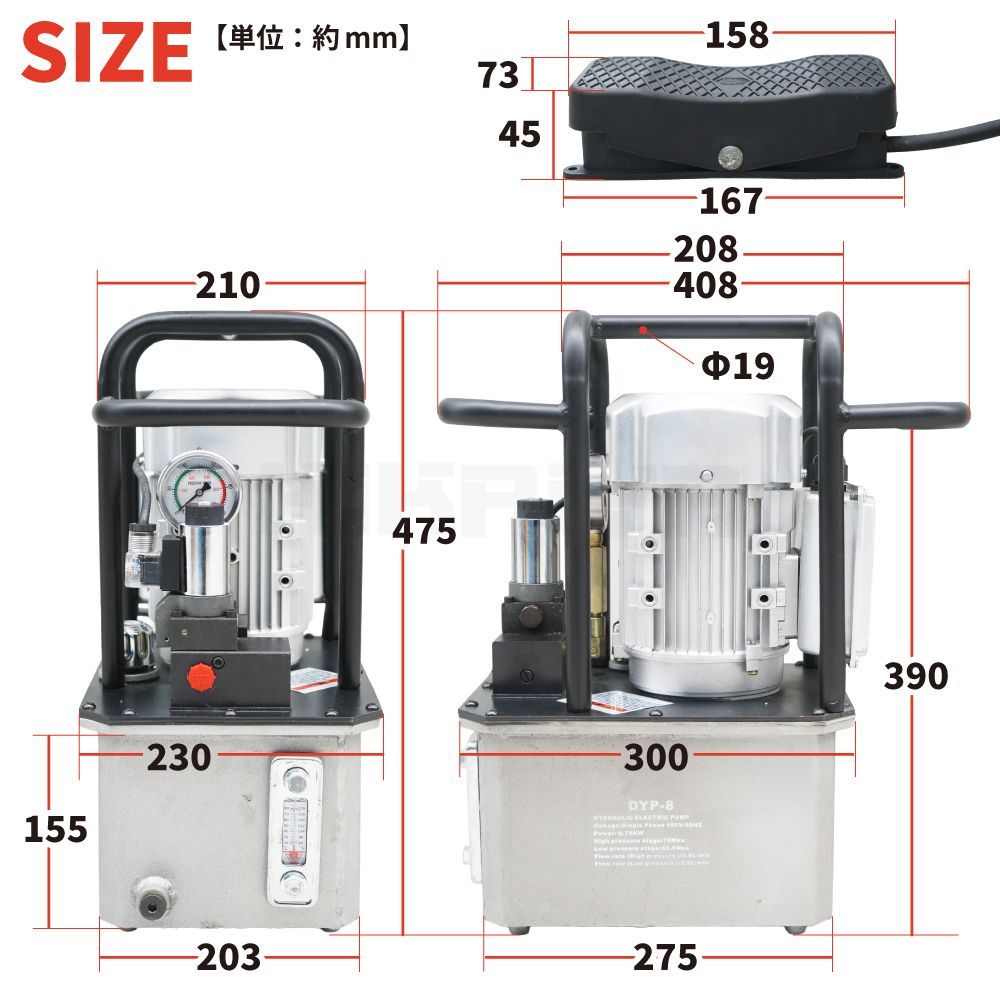 油圧ポンプ 電動 8 L フットバルブ 3 8インチ 70 Mpa 750 W 2段階出力 容量8リットル 電動油圧ポンプ KIKAIYA →