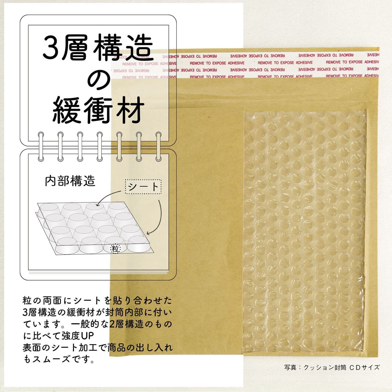 封筒の中に緩衝材(プチプチ)を装着しており、中身を衝撃から守ることができる。CD・DVD等衝撃を与えたくない物を発送するのに向いている。テープ付きのため、簡単に梱包できる。防水にも優れいている。
