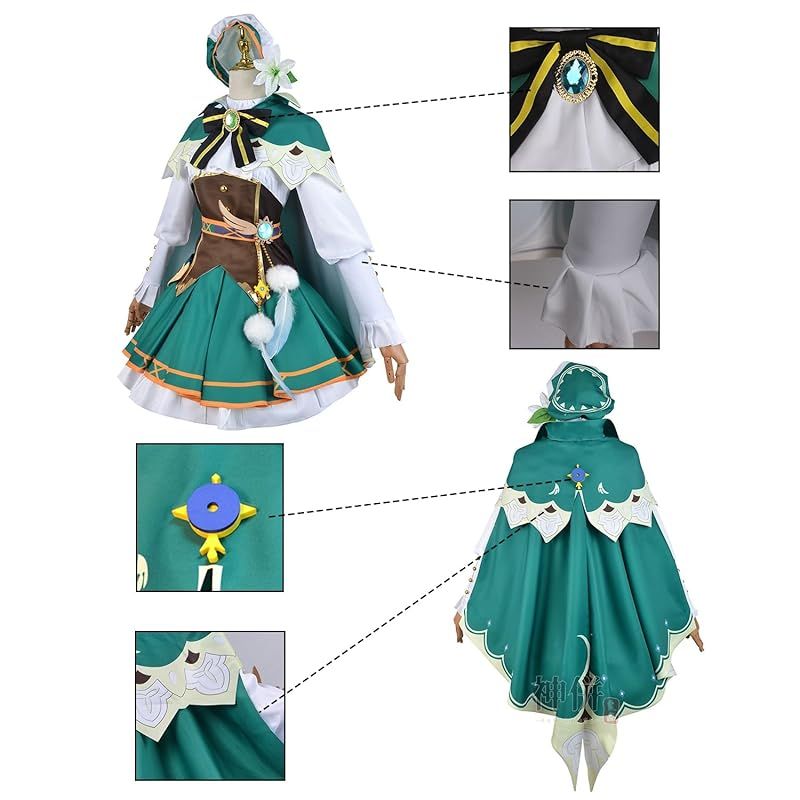 ※【セット内容】:「ウィッグ」+「トップス」+「スカート」+「マント」+「ソックス」+「ベルト」+「帽子」+「腰飾り」+「神の目」+「蝶タイ」。ポリエステルな生地を使用し,質感や細部も丁寧につくられておりますので,本格的な着こなしが可能です。