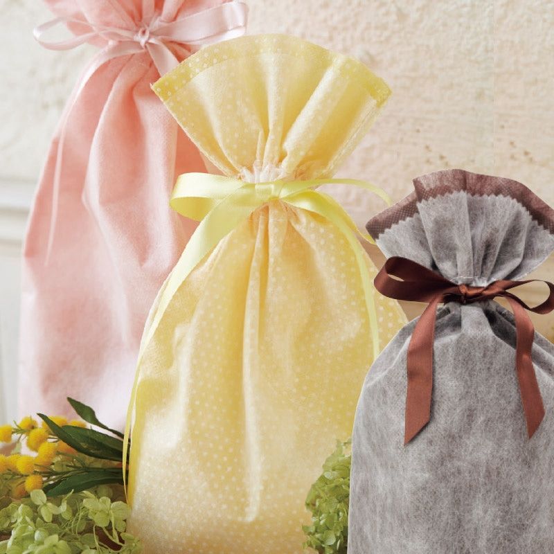 不織布を2層に重ねたギフト巾着袋です。両脇のリボンを引っ張って結ぶだけの簡単ラッピング。ベースのブラウン色の上に薄手の白を重ねることで、やさしく上品なイメージのギフトに仕上がります。底にマチがあって広がるので、見た目よりも容量があります。