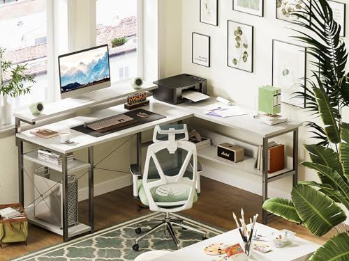 【棚付きデスク・収納力満載】デスクの足元には一体型のラックが備え、本や書類などを使いたい時にサッと取り出せます。たっぷりの収納でデスク周りをスッキリ快適に!L字型のデザインで部屋のコーナーを最大限に活用でき、ご家庭でもオフィスでも、日常の仕事に十分なスペースを確保できます。