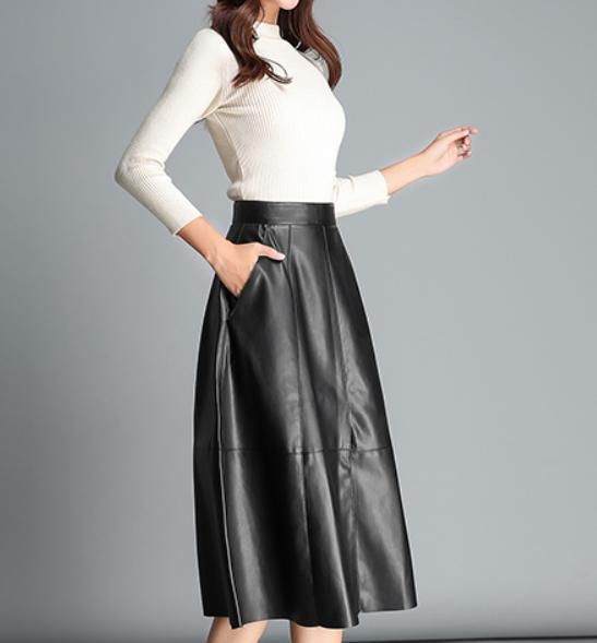 リアルレザー 羊革 フ スカート 本革素材 ラム ミモレ丈 黒