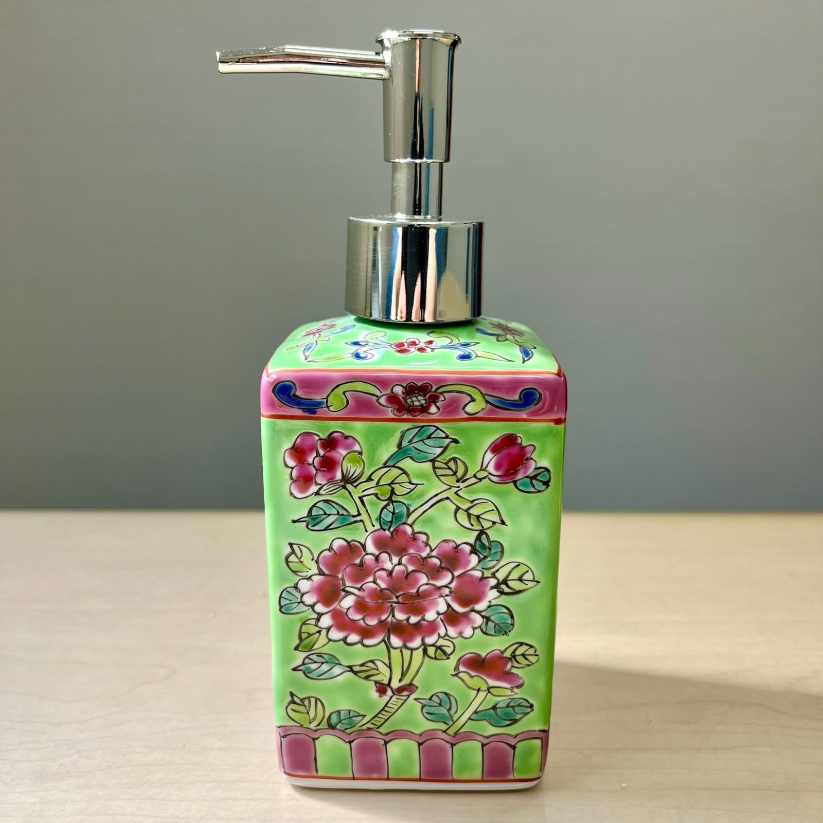 41若 プラナカン シャンプー ソープ ディスペンサー ニョニャウェア フラワー柄 花柄 陶器 若草 緑 グリーン シンガポール マレーシア 土産 お土産