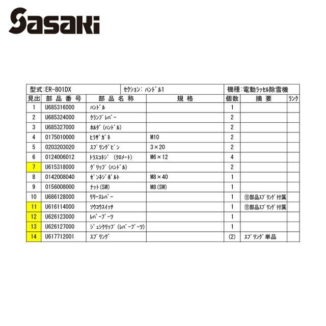 ササキ| 電動ラッセル除雪機 部品 オ スーノ用 ハンドル周り一式