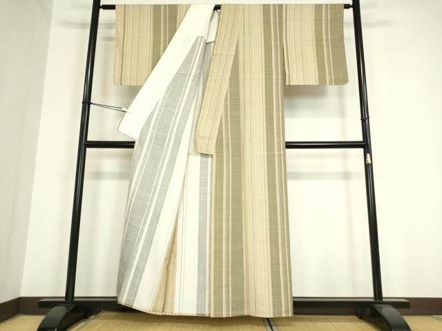 平和屋着物 上質な紬 単衣 白糸の滝 毛万 譜立割小紋 縞 反端付き 正絹 az