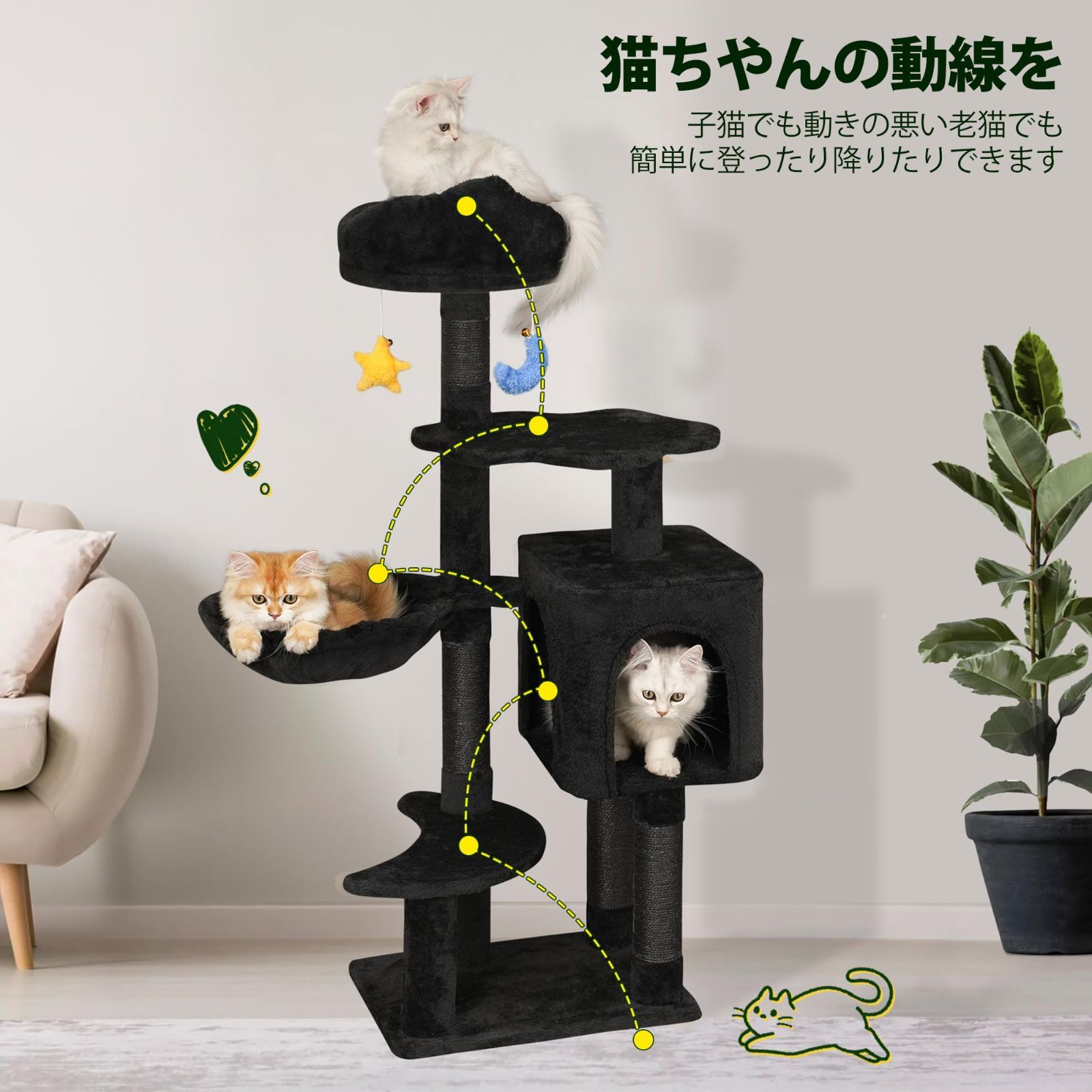 Meecal キャットタワー 猫タワー 中型 子猫 多頭飼い ハウス 猫 爪研ぎ タワー キャットタワー可愛 雲型 い猫 ベッド 天然サイザル麻 ハンモック おもちゃ 据え置き 転倒防止 運動不足解消 省スペース - 高さ110 cm ブラック