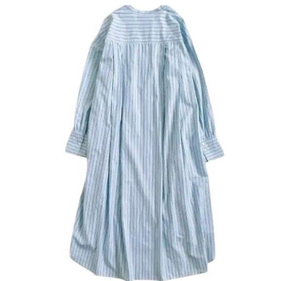 春夏のコーディネートに映えるクリーンな印象のシャツワンピーストレンドのバンドカラーデザインのシャツワンピース。バックに心地よい分量感のタックを入れ、カジュアルすぎず大人な雰囲気に。袖のボリューム感をプラスしており、捲らなくともふわっと仕上がるボリュームに設定しています。