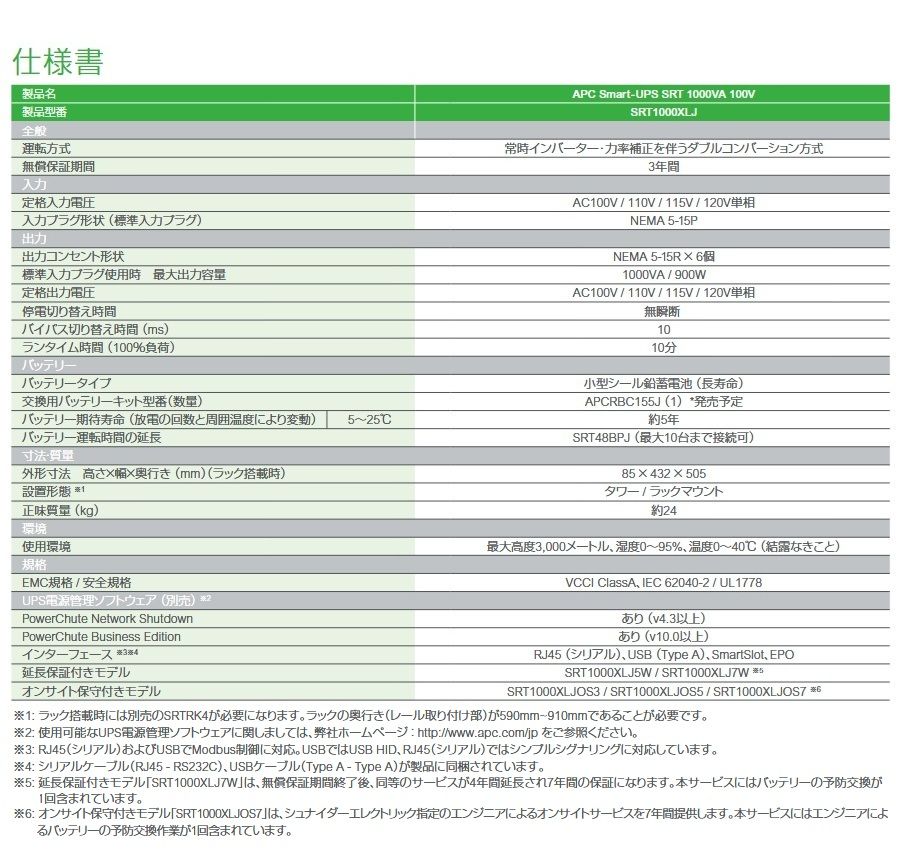 APC Smart-UPS SRT 1000 VA 100 V 無停電電源装置 UPS シュナイダーエレクトリック